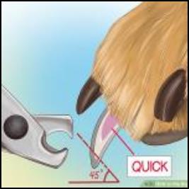 It is generally easiest to trim your dog's nails while he is lying down. Find the quick by looking at the underside of his nail towards the tip. The nail should form a triangular shape with two outer "walls." There is no quick at this point, making it safe to cut. Look at the cross section of the nail between each cut. The center will turn a fleshy white to gray color when you are getting close to the quick. Line up your trimmers by placing the edge of the blade upon the nail at the "cut line." Squeeze the trimmers in one swift, deliberate motion. Avoid cutting if the dog is moving (which may be easier said than done).